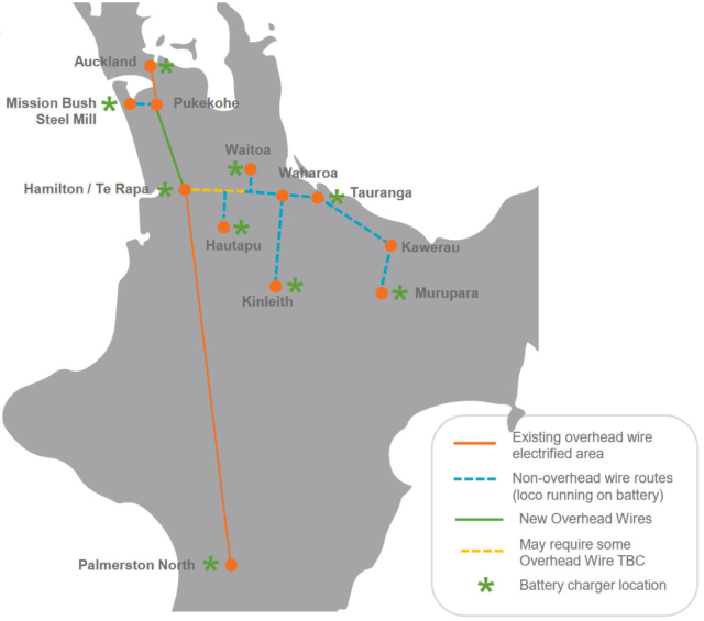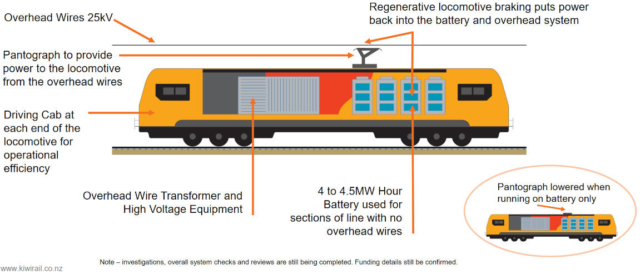 When in operation, freight trains between Auckland and Tauranga would use the overhead power between Auckland and Te Rapa then mostly move on battery power between Te Rapa and Tauranga No locomotive change would be required for the journey.